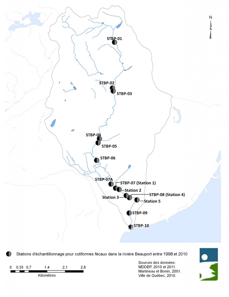 La qualité bactériologique de l’eau de la rivière Beauport a quant à elle fait l’objet d’un suivi sporadique depuis la fin des années 90. Entre 1998 et 2001, 11 stations et 13 conduites pluviales ont été échantillonnées par la Communauté urbaine de Québec (Martineau et Bonin, 2001). À cette époque, l’eau de la rivière Beauport était de bonne qualité en amont mais se dégradait au niveau des zones urbanisées débutant au boulevard Rochette (aujourd'hui Louis-XIV), où existait un problème de branchements croisés. Neuf conduites dépassaient le seuil de 1 000 UFC/100 ml au moins une fois entre 1998 et 2001 (Martineau et Bonin, 2001). La qualité de l’eau aux 6 stations situées en aval de l’autoroute Félix Leclerc a été évaluée une fois par année par la Ville de Québec pour la tenue de l’activité de pêche en ville (stations 1 à 6). Les données les plus récentes (2010) indiquent une amélioration de la qualité bactériologique. Toutefois, un seul échantillonnage ne permet pas de conclure à une amélioration statistiquement valable.