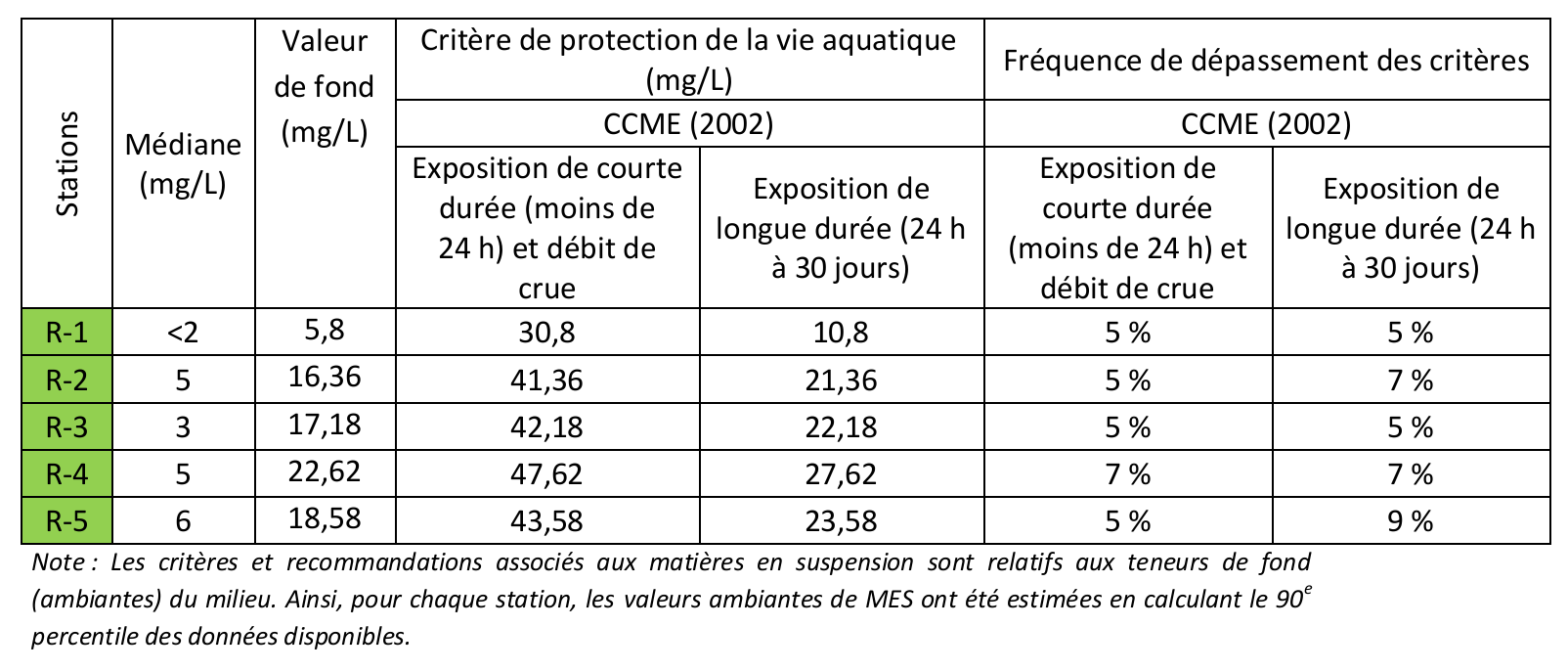 Les critères et recommandations associés aux matières en suspension sont relatifs aux teneurs de fond (ambiantes) du milieu. (Roche, 2011a). Ainsi, les valeurs en teneur de fond des MES, pour chaque station du suivi régulier (R-1 à R-5) ont été calculées en prenant le 90e percentile des données disponibles pour chaque station (Roche, 2011a). Pour le secteur agricole, la valeur de teneur de fond a été estimée en calculant le 90e percentile des données disponibles, toutes stations confondues. Les données sont comparées aux valeurs de fond dans les tableaux ci-dessous.