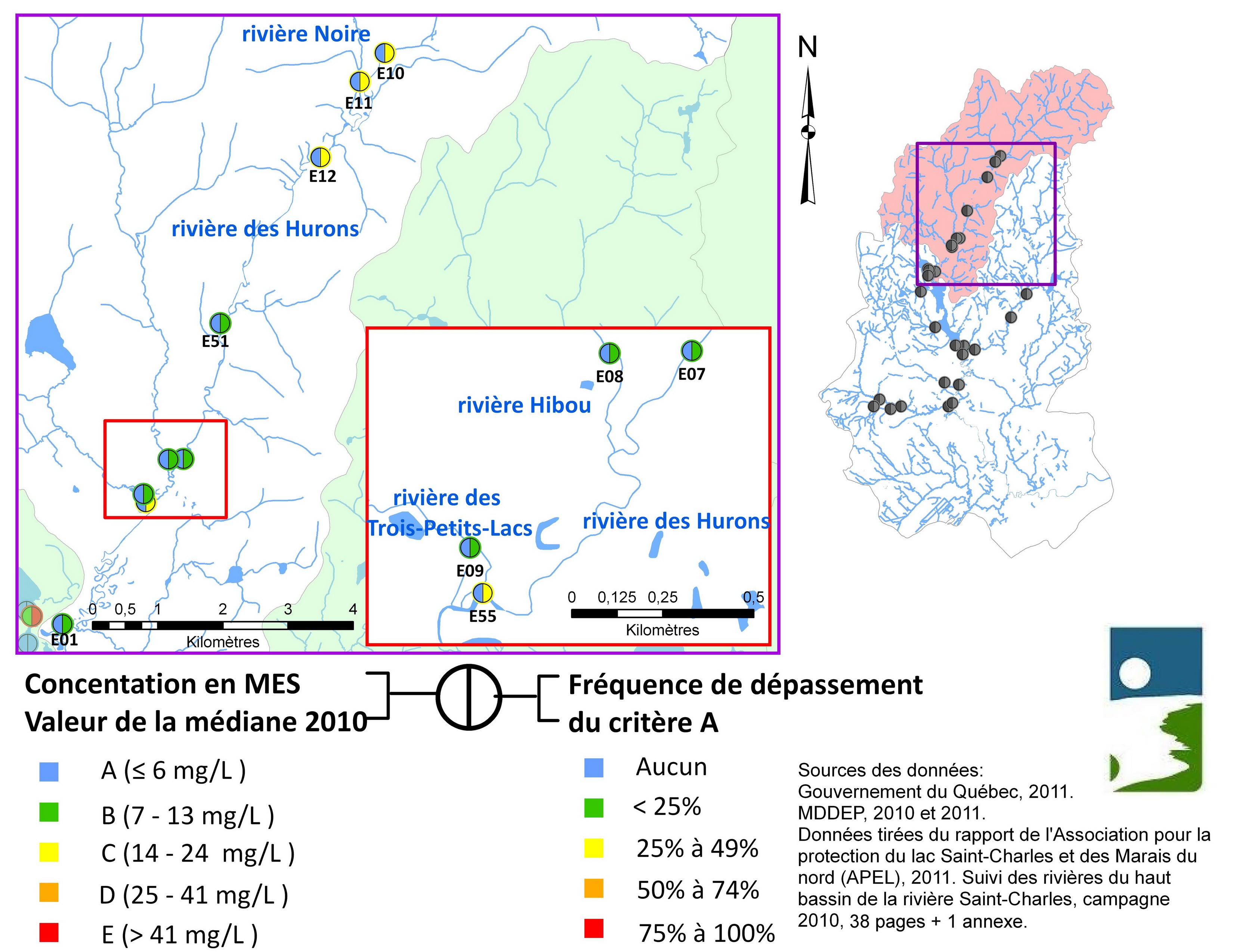 Les concentrations de matières en suspension, quant à elles, sont restées basses en 2010, autant en amont (E02) qu’en aval (E50). Celles-ci ne constituent donc pas une problématique pour cet affluent du lac Saint-Charles (APEL, 2011). Il en va de même en 2011 où aucun dépassement n'a été observé à la décharge du lac et aucun dépassement de la norme de la Stratégie pancanadienne pour la gestion des effluents d'eau usées municipales du Conseil canadien des ministres de l'Environnement (25 mg/L) n'a été observé à l'usine d'épuration des eaux usées (APEL, 2012).