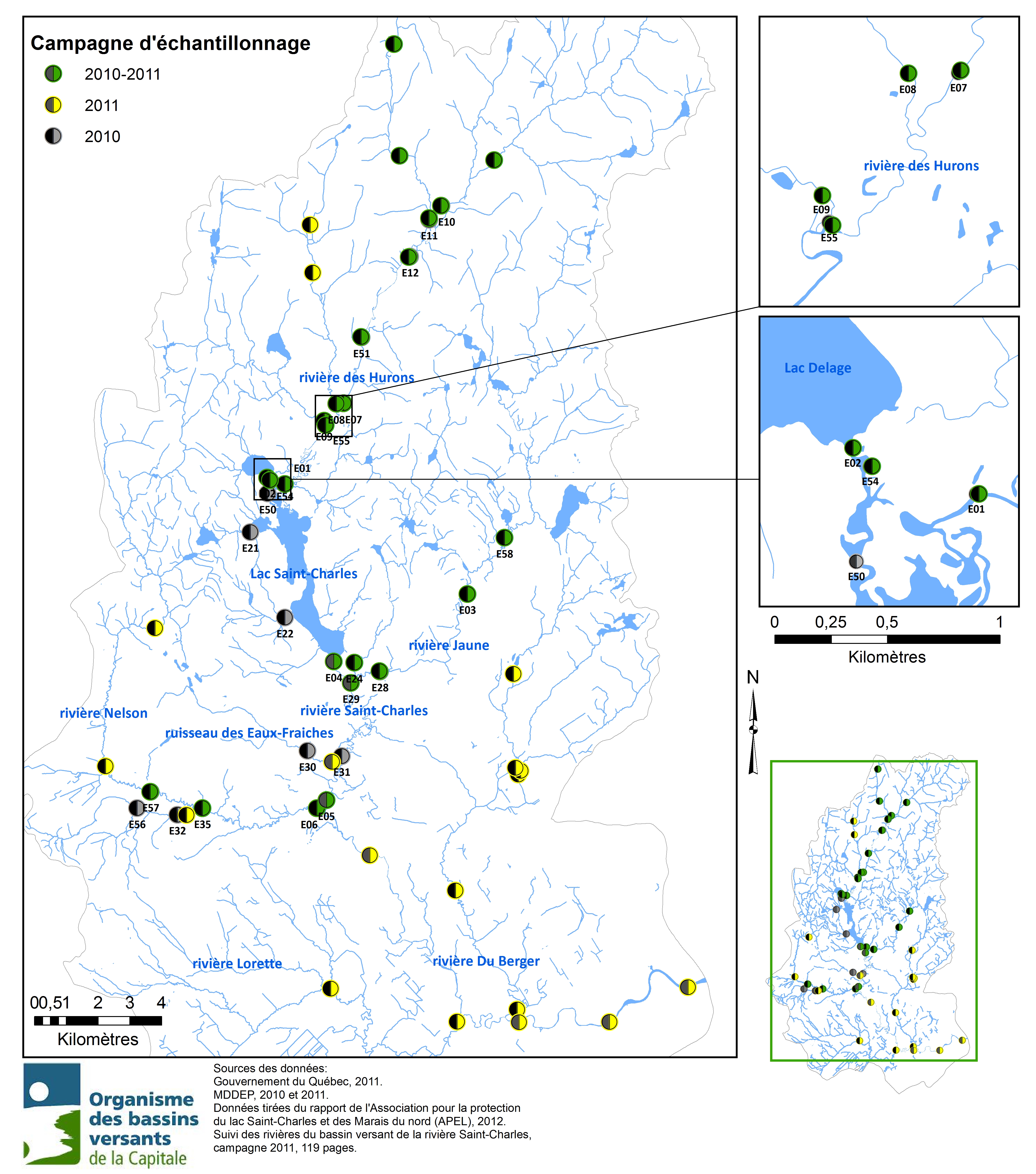 Au fil des ans, plusieurs campagnes d’échantillonnage ont été effectuées sur le bassin versant de la rivière Saint-Charles par diverses instances. L’Association pour la protection de l’environnement du lac Saint-Charles et des Marais du Nord (APEL) est l'une d'entre elles, et a réalisé des relevés sur les principales rivières du haut-bassin versant de la rivière Saint-Charles depuis 2002. Ces campagnes ont été intensifiées en 2008 et 2009 dans le cadre de l’Étude limnologique du haut-bassin versant de la rivière Saint-Charles. En 2010, 25 stations ont été échantillonnées dans le haut-bassin et les paramètres mesurés étaient la température, le pH, la conductivité, l’oxygène dissous (OD), les coliformes fécaux (CF), le phosphore total (PT) et les matières en suspension (MES). En 2011, 39 stations ont été visitées sur l'ensemble du bassin versant et les paramètres suivants se sont ajoutés à ceux de 2010 pour toutes les stations: la turbidité et la chlorophylle α. Les composés azotés (azote total, azote ammoniacal et nitrites/nitrates) ainsi que les ions chlorures ont aussi été mesurés à certaines stations.